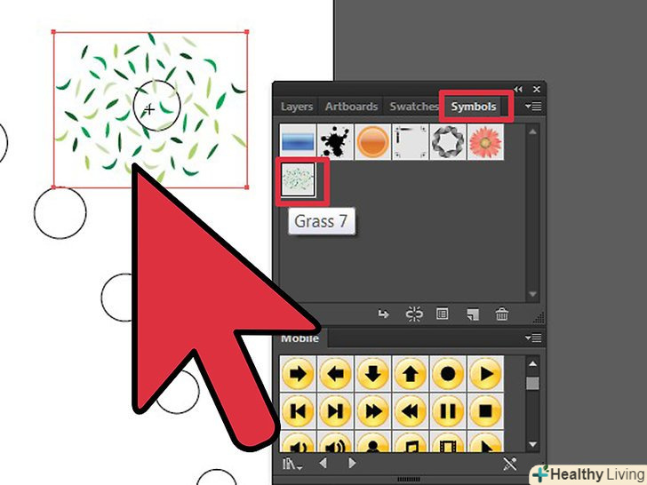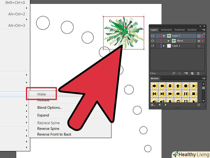 Виберіть коло і траву, потім виберіть Об'єктgt; змішати gt; зробити.Наведіть змішану траву на вершину лінії кіл (як показано нижче). Виберіть коло і траву, потім виберіть Об'єктgt; змішати gt; зробити.Наведіть змішану траву на вершину лінії кіл (як показано нижче).