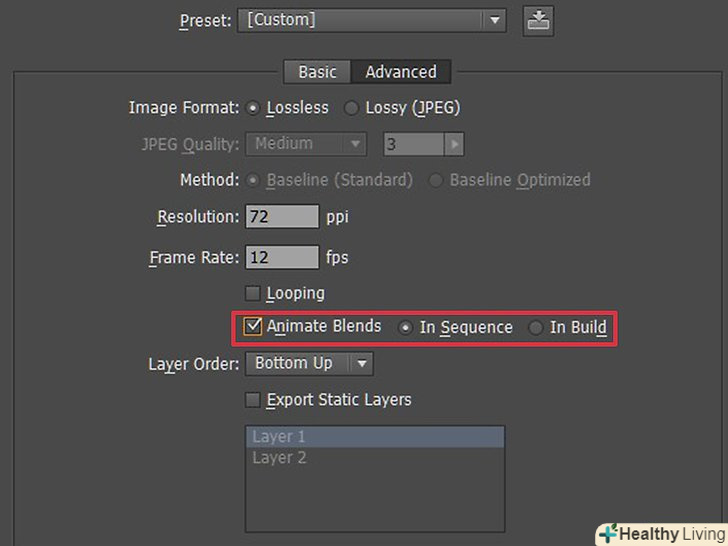 Перейдіть до Файлgt; експортувати gt; Виберіть місце для збереження і встановіть тип файлу Flash ( * . SWF). В поле опції SWF встановіть експорт в: AI шари в SWF-кадри, версія: Flash Player9, потім натисніть кнопку Advance, поставте галочку біля Анімація змішування (Animate Blend) і послідовно (In Sequence)gt; Ok. Перейдіть до Файлgt; експортувати gt; Виберіть місце для збереження і встановіть тип файлу Flash ( * . SWF). В поле опції SWF встановіть експорт в: AI шари в SWF-кадри, версія: Flash Player9, потім натисніть кнопку Advance, поставте галочку біля Анімація змішування (Animate Blend) і послідовно (In Sequence)gt; Ok.
