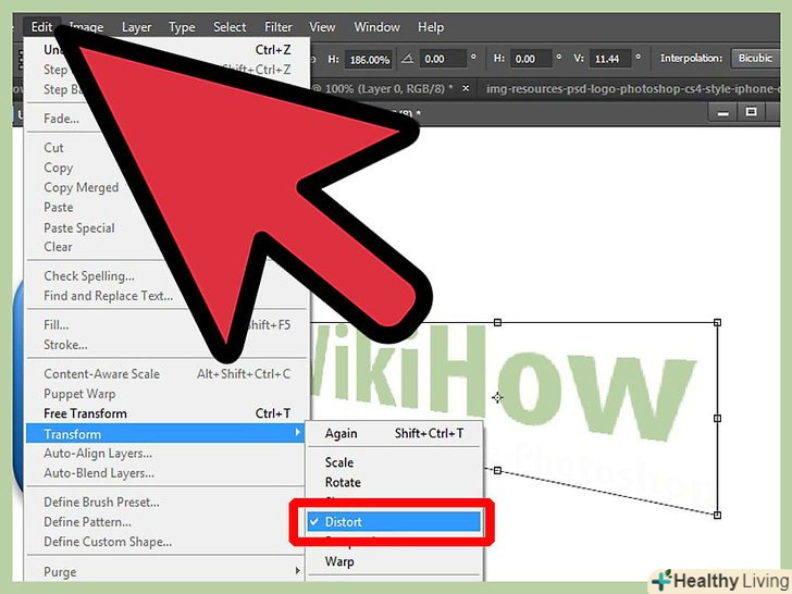 Додаткове редагування.можливо, ви виявите, що текст потребує додаткового редагування, так як поверхня, на якій він написаний, будь-яким чином повернута в просторі. Ви можете підлаштувати текст під таку поверхню, клацнувши правою кнопкою миші по назві шару з текстом і в меню вибравши «Растрировать текст» (в режимі растрирования сам текст редагувати не можна). Після цього натисніть "редагування» - «трансформування» - "деформація". Перетягнувши мітки навколо тексту, ви зміните його перспективу. Додаткове редагування.можливо, ви виявите, що текст потребує додаткового редагування, так як поверхня, на якій він написаний, будь-яким чином повернута в просторі. Ви можете підлаштувати текст під таку поверхню, клацнувши правою кнопкою миші по назві шару з текстом і в меню вибравши «Растрировать текст» (в режимі растрирования сам текст редагувати не можна). Після цього натисніть "редагування» - «трансформування» - "деформація". Перетягнувши мітки навколо тексту, ви зміните його перспективу.