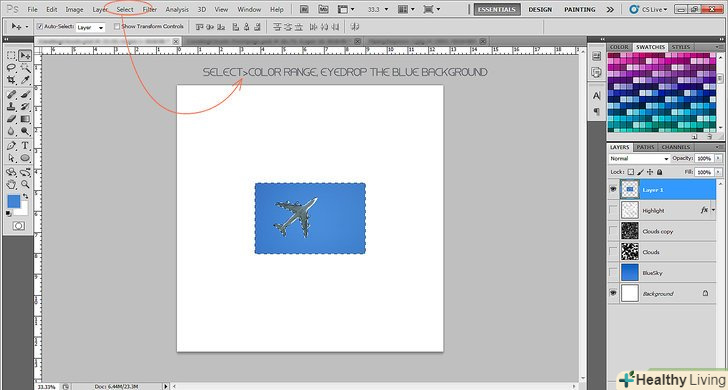 В кінці для завершення вашого малюнка знайдіть зображення літака, що летить в небі.вставте цю картинку в своє творіння і сховайте шар хмар. Перейдіть в Select(виділення)gt;Color Range (вибір кольору) і виберіть блакитний фон для літака. В кінці для завершення вашого малюнка знайдіть зображення літака, що летить в небі.вставте цю картинку в своє творіння і сховайте шар хмар. Перейдіть в Select(виділення)gt;Color Range (вибір кольору) і виберіть блакитний фон для літака.