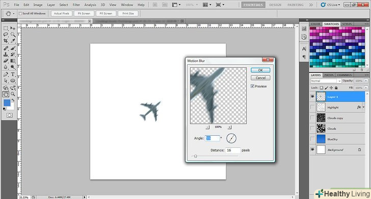 Потім після стирання фону застосуєте до літака ефект розмиття. щоб застосувати цей ефект, перейдіть в Filter(фільтр)gt;Blur(розмиття)gt;Motion Blur (розмиття в русі). Скопіюйте Налаштування розмиття з доданої ілюстрації. Потім після стирання фону застосуєте до літака ефект розмиття. щоб застосувати цей ефект, перейдіть в Filter(фільтр)gt;Blur(розмиття)gt;Motion Blur (розмиття в русі). Скопіюйте Налаштування розмиття з доданої ілюстрації.