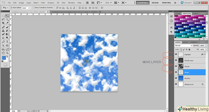 Перемістіть шар нижче шару з хмарами і вище фону з блакитним небом. Перемістіть шар нижче шару з хмарами і вище фону з блакитним небом.