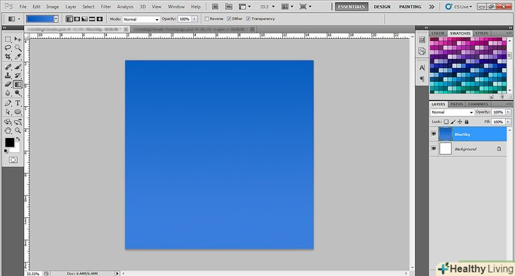 - Потім створіть новий шар і перейменуйте його. Застосуйте градієнт за допомогою інструменту "градієнт". За допомогою редактора градієнта відредагуйте його і виберіть два відтінки блакитного, наприклад полуденний блакитний і Королівський блакитний або темно-блакитний і небесно-блакитний.