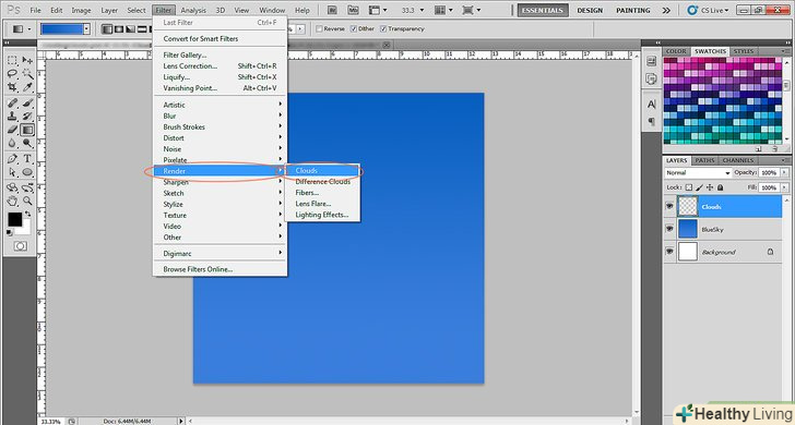 Додайте новий шар або натисніть Shift + Ctrl + N. потім перейдіть в меню Filter(фільтр)gt;Render(Рендеринг)gt;Clouds(хмари), щоб створити Хмари. Додайте новий шар або натисніть Shift + Ctrl + N. потім перейдіть в меню Filter(фільтр)gt;Render(Рендеринг)gt;Clouds(хмари), щоб створити Хмари.