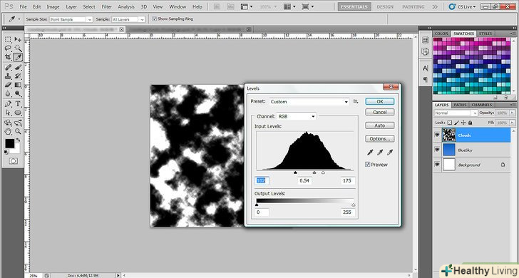 Потім натисніть комбінацію клавіш Ctrl + L, щоб з'явилося діалогове вікно "рівні", і відрегулюйте рівні яскравості хмар.скопіюйте налаштування з доданої ілюстрації або просто перемістіть всі повзунки в середнє положення. Потім натисніть комбінацію клавіш Ctrl + L, щоб з'явилося діалогове вікно "рівні", і відрегулюйте рівні яскравості хмар.скопіюйте налаштування з доданої ілюстрації або просто перемістіть всі повзунки в середнє положення.