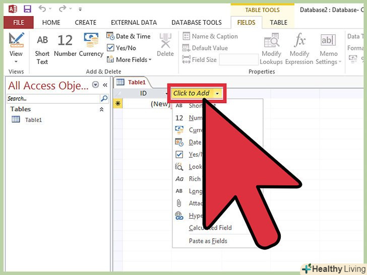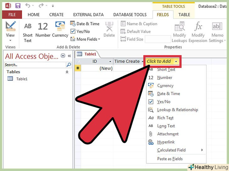 Натисніть на жовту комірку з написом: «Натисніть для додавання". З меню, що з'явиться, виберіть тип даних для поля. У списку є наступні пункти « "короткий текст" для невеликої текстового запису, на зразок імені або поштової адреси,» числовий«,» грошовий«,» Дата і час " та інші.