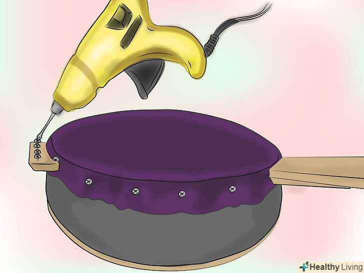 Натягніть барабанний пластик на лицьову частину корпусу, закріплюючи шурупами по краях.так само можна використовувати тканину або навіть шкіру тварини. Для даного прикладу на зображенні використовувалася штучна шкіра. Врахуйте, матеріал повинен бути натягнути дуже туго.