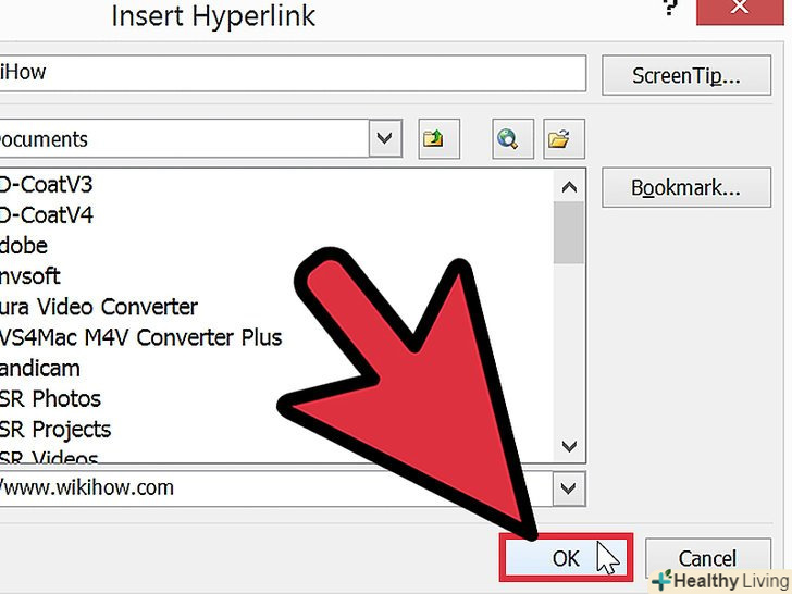 Заповніть поля. Графа «посилання на» (Link to) має на увазі вказівку бажаної вами URL-посилання шляхом вибору адреси веб-сайту зі списку або введення іншого ресурсу.