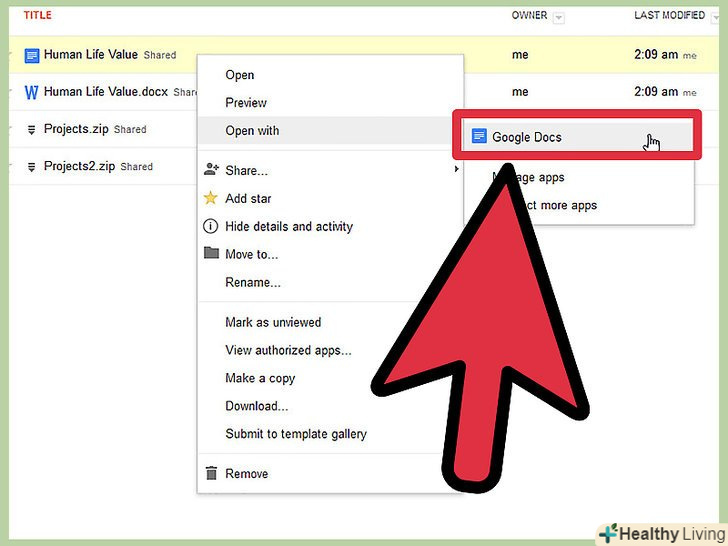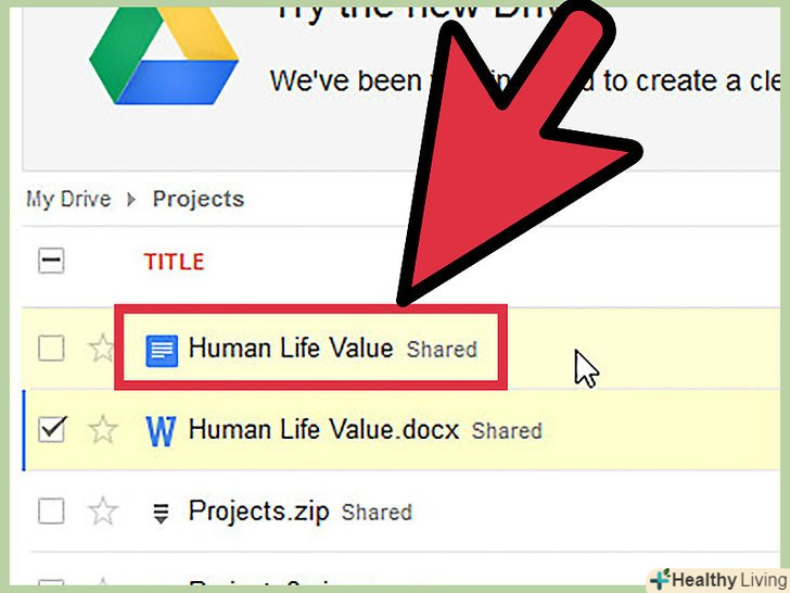 Перетворіть документ.коли файл завантажиться в Google Диск, відкрийте його і натисніть "Відкрити в додатку Google Документи" у верхній частині вікна. Тепер документ можна редагувати.- Якщо не натиснути "Відкрити в додатку Google Документи", документ можна переглянути, але не відредагувати на диску.