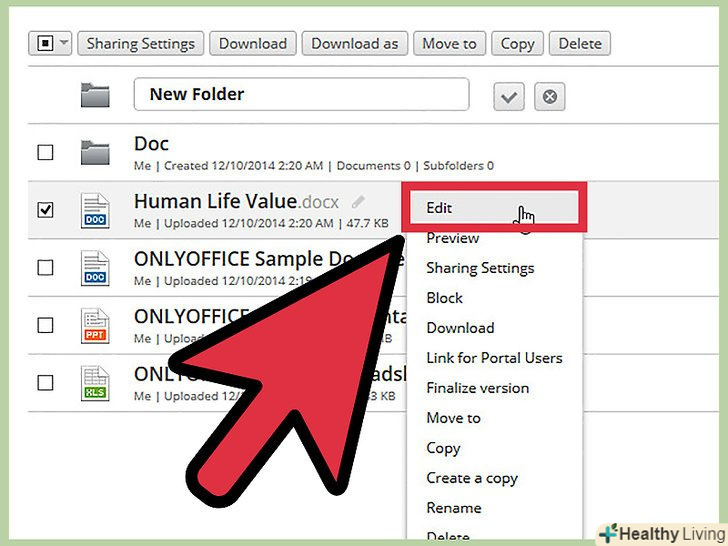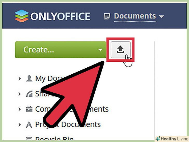 Завантажте файл DOCX.натисніть «Завантажити» у верхньому лівому куті (поруч із кнопкою «Створити»). ONLYOFFICE підтримує формат DOCX, тому нічого перетворювати не потрібно.- Відкриється вікно Провідника або Finder, в якому знайдіть потрібний файл.
