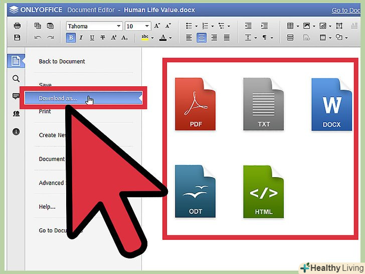 Скачайте файл на комп'ютер в будь-якому форматі (PDF, TXT, DOCX, ODT, HTML).натисніть на значок "Файл«, розташований зліва в меню, і виберіть»Завантажити як". Файл буде завантажений на комп'ютер.[4]