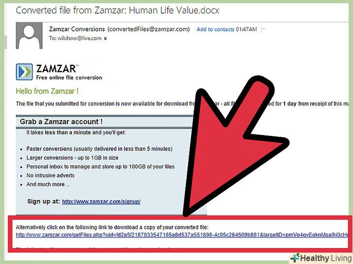 Скачайте перетворений файл.через мить перетворений документ буде доступний для завантаження. Залежно від сервісу документ буде відправлений вам по електронній пошті, або потрібно буде клацнути по посиланню для завантаження на сайті сервісу. Якщо Ви користуєтеся програмою-конвертером, файл буде поміщений в папку, призначену для перетворених документів.