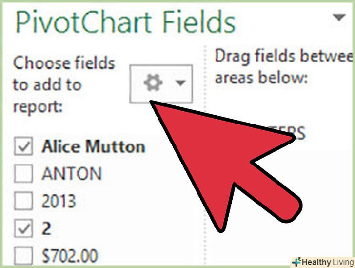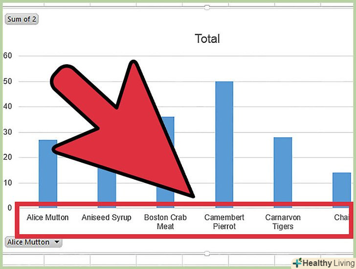 Виберіть заголовок стовпця, що містить дані, які потрібно відобразити на" х " осі поля і перетягніть його в розділ «Значення» списку полів у зведеній таблиці.- Наприклад, якщо джерело даних являє собою електронну таблицю продажів за видами продукції і по іменах клієнтів, ви можете вказати або імена клієнтів або стовпці назви продуктів в розділ "Поле осі". Ви також повинні перетягнути заголовок стовпця на суму продажів у розділі "Значення".