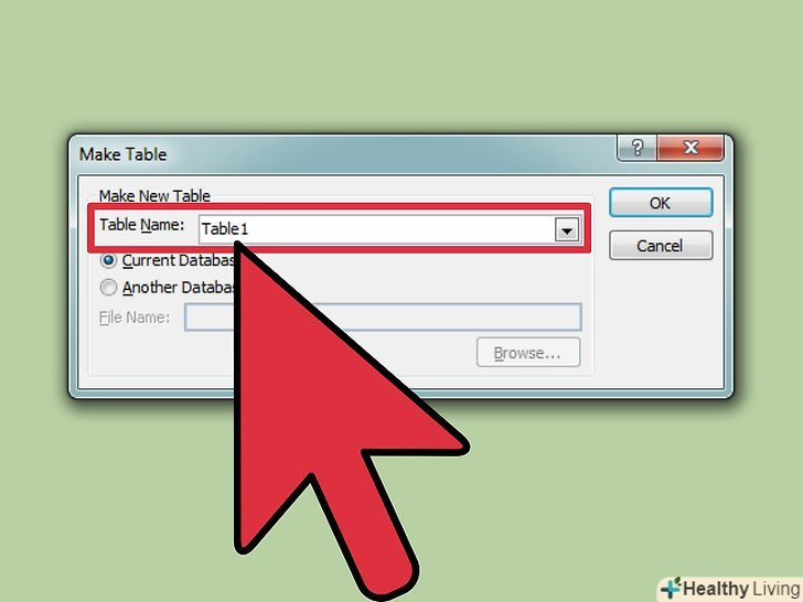Вкажіть ім'я нової таблиці, якщо вона буде створена в базі даних, в якій ви в даний момент працюєте або в іншій базі даних.- Якщо ви створюєте таблицю для окремої бази даних, то вам доведеться вказати її місце розташування.