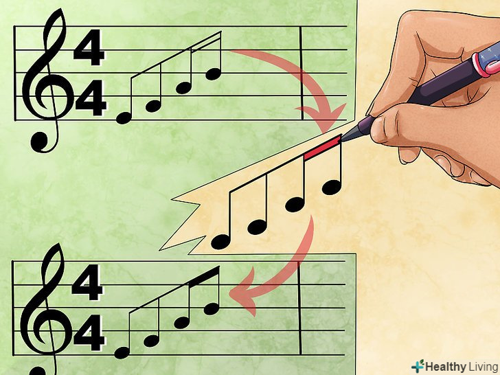 Зв'яжіть ноти!як видно з попереднього прикладу, якщо на нотному стані занадто багато нот, читати їх стає важче. Погляд збивається, і ви втрачаєте ноту. Щоб згрупувати ноти для простоти в групи поменше, потрібно з'єднати їх в'язками.- Зв'язки замінюють індивідуальні прапорці товстими лініями, що з'єднують штилі нот. Існує цілком логічна система з'єднання нот і, хоча в більш складних музичних творах з'єднання ніг можуть бути дуже складними, для наших цілей досить з'єднувати ноти в четвертні. Порівняйте картинку внизу і картинку вгорі. Знову простукайте ритм і зверніть увагу, наскільки зв'язки полегшують читання нотацій.