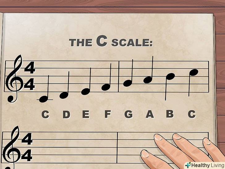 Вивчіть до мажорний звукоряд. До мажорний звукоряд-основний звукоряд, що використовується в західній музиці. Велика частина інших звукорядів, які ви будете вивчати, походять від нього. Як тільки ви увіб'єте її в підкірки мозку, інші звукоряди будуть даватися легше.- Спочатку ми покажемо, як вона виглядає, потім-що означає — Після чого приступимо до читання нот. Ось як вона виглядає на нотному стані. До мажорний звукоряд представлений на зображенні вище.