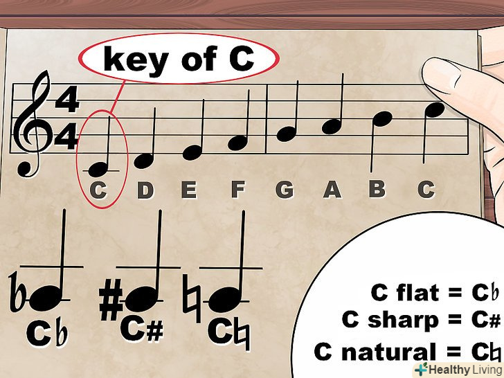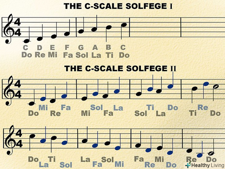 ОсвойтеСпів з листа (сольфеджіо).Нехай вас не лякають ці слова-це просто спів нот до, ре, мі і так далі.- Освоюючи спів нот з листа, ви розвинете навик читання нот бічним зором — навик, на доведення до ідеалу якого може знадобитися все життя, і який буде дуже корисний на початкових етапах. Давайте ще раз подивимося на звукоряд до мажор, але тепер додамо назви нот. Звукоряд до мажор з назвою нот представлений під "C Scale Solfege 1" на зображенні вище.