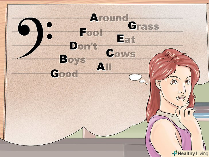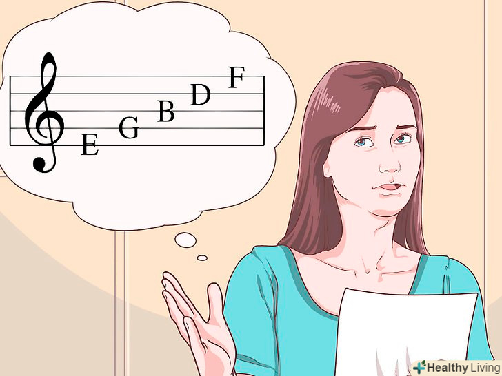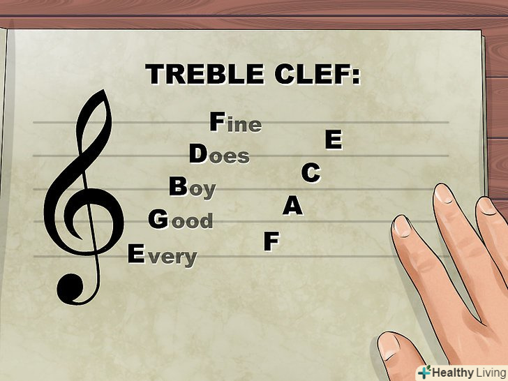 - Якщо вам важко їх запам'ятати, використовуйте для цього мнемоніку. Для ліній найчастіше використовують мнемоніку "Every Good Boy Does Fine" (англ. "у кожного хорошого хлопчика все добре»), а ноти в проміжках і так складають слово «FACE» (англ. «особа»). Вправи зонлайн-інструментом з розпізнавання нот — це ще один відмінний спосіб закріпити матеріал.