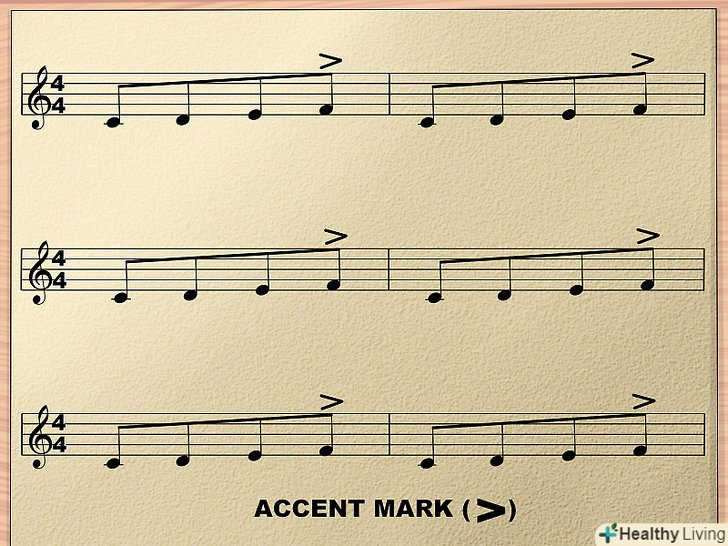 - Зверніть увагу на знаки акценту (gt;) над кожною четвертною нотою C. знову простукайте цей ритм, тільки цього разу робіть акцент на кожній ноті зі знаком акценту. Тепер замість вертольота у вас повинен вийти поїзд. Лише злегка змінивши наголос, ми повністю змінили характер музики!