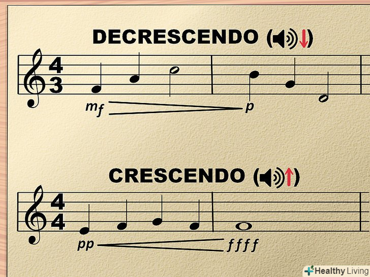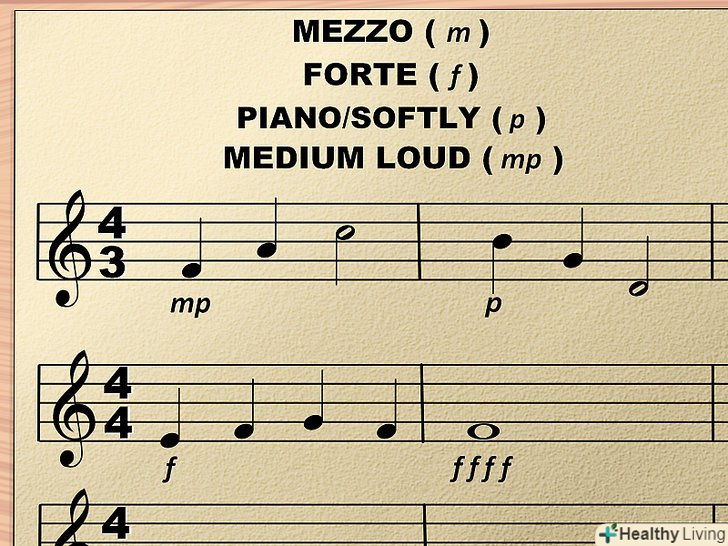 Грайте в піано, фортіссімо або десь між ними.так само, як людина не завжди говорить з однією і тією ж гучністю — він то підвищує, то знижує гучність голосу в залежності від ситуації — так і гучність музики постійно змінюється. Музикант дізнається, з якою гучністю потрібно грати, завдяки знакам динаміки, які розставляє на нотному стані композитор.- Існують десятки позначень динаміків на нотному стані, але найчастіше ви будете зустрічати букви f, m і p.