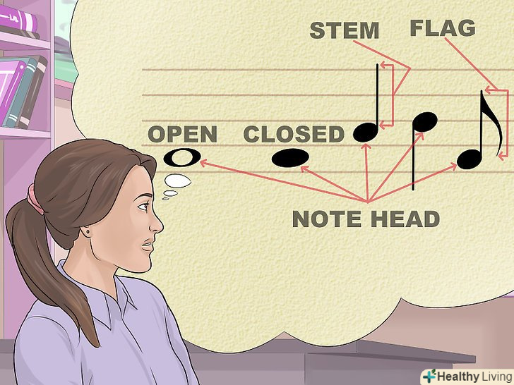 Елементи ноти. кожен окремий символ ноти включає в себе до трьох елементів: головка, штиль і прапорець.- Головка ноти. Це овал, який може бути порожнім (білим) або зафарбованим (чорним). По суті, головка ноти показує Виконавцю, яку ноту грати.
