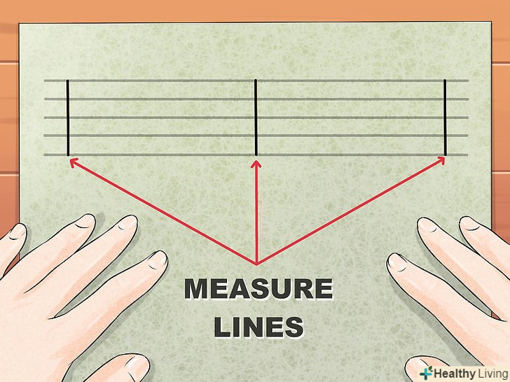 Тактова риса.зверніть увагу на тонкі вертикальні лінії на нотному записі, що перетинають запис через певні проміжки. Ці лінії представляють тактові риси-простір до першої лінії вважається першим тактом, простір між першою і другою лініями представляє другий такт, і так далі. Тактова риса не впливає на звучання музики, але допомагає Виконавцю в ній орієнтуватися.- Як видно нижче, такти також корисні тим, що вони всі мають однакову кількість часток. Наприклад, якщо ви почнете відбивати «1-2-3-4», коли по радіо буде грати пісня, швидше за все, ви вже на підсвідомому рівні визначили тактові лінії.