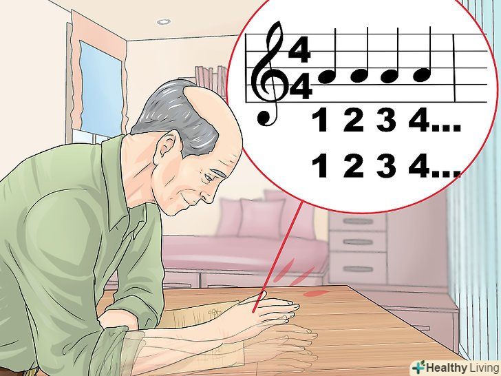 - Найлегше зрозуміти тактовий розмір 4/4, також відомий як» стандартний " розмір. При розмірі 4/4 в кожному такті є чотири частки, а кожна четвертна нота дорівнює одній частці. Цей тактовий розмір можна почути в більшості композицій популярної музики. Ви можете відбивати стандартний тактовий розмір, відраховуючи " 1-2-3-4 1-2-3-4..."кожен такт.