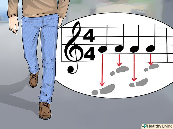 Уявіть, що ви гуляєте. кожен крок відповідає одному удару, які в музичній нотації будуть записуватися четвертними нотами. А все тому, що в більшості західної музики один такт складається з чотирьох часток. Нотний запис вашої прогулянки буде такий:- Кожен крок дорівнює одній четвертній ноті. У нотному записі четвертні ноти представляються у вигляді зафарбованих чорних крапок, прикріплених до штиля без будь-яких прапорців. Можете вважати кроки: «1-2-3-4, 1-2-3-4» і так далі.