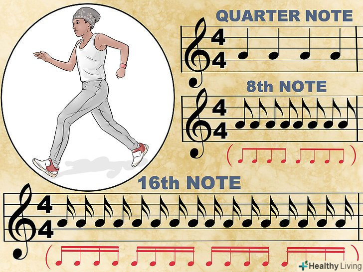- Щоб прискорити нотатки, їм потрібно додати прапорець. Кожен прапорець знижує тривалість ноти наполовину. Наприклад, восьма нота (з одним прапорцем) за тривалістю дорівнює половині четвертної, а шістнадцята (з двома прапорцями) — половині восьмої. Повертаючись до ходьби, це означає, що ми переходимо від кроку (четвертна нота) на біг (восьма нота, в два рази швидше ходьби), а потім на спринт (шістнадцята нота, в два рази швидше звичайного бігу). Уявіть, що кожна четвертна нота це крок, і простукайте приклад вище.