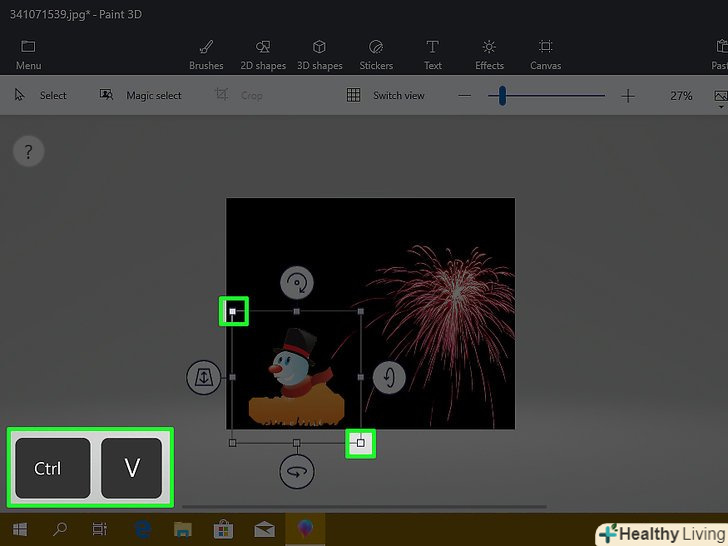Вставте вирізаний фрагмент на новий фон. Коли відкриється фонове зображення, натисніть Ctrl+v, щоб вставити вирізаний фрагмент вихідного зображення на новий фон.- Якщо хочете, змініть розмір вихідного зображення; для цього утримуйте і перетягніть один з його кутів всередину або назовні.