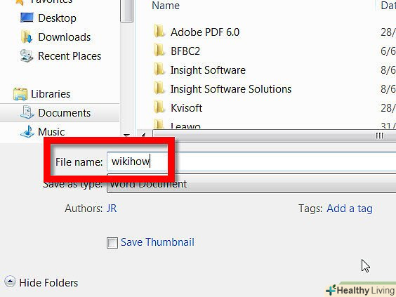 Впишіть нове ім'я файлу в поле»Save as".змініть місце зберігання файлу, якщо є необхідність. Місце зберігання визначається в основному полі діалогового вікна, воно розташоване під заголовком «Save in».- Клікніть на кнопку»Save".
