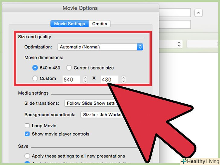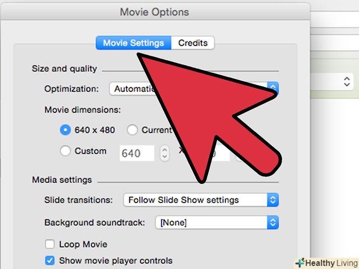 Виберіть опцію "якість". це категорія оптимізації, яка регулює розмір і якість вікна, в якому відкриється презентація. Ця опція буде експортувати презентацію, зроблену в PowerPoint, в найкращій якості, як тільки ви перемістите її в iMovie.