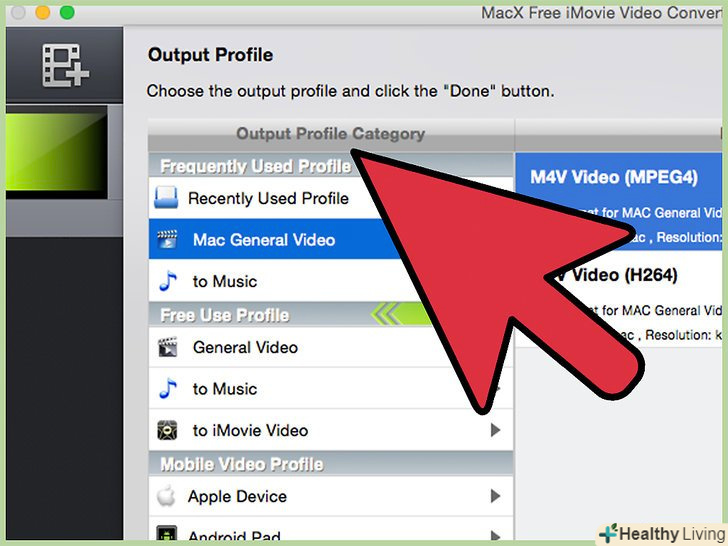Виберіть вихідний формат, який хочете отримати з відео Вашої PowerPoint-Презентації.зробіть це, натиснувши на випадаюче меню профілю "MOV в iMovie". Для використання iMovie краще вибрати формат MPEG 4 (додасть відеофайлу меншого розміру) і DV (створює кращу якість відео). Обидва ці формати можна імпортувати в iMovie.