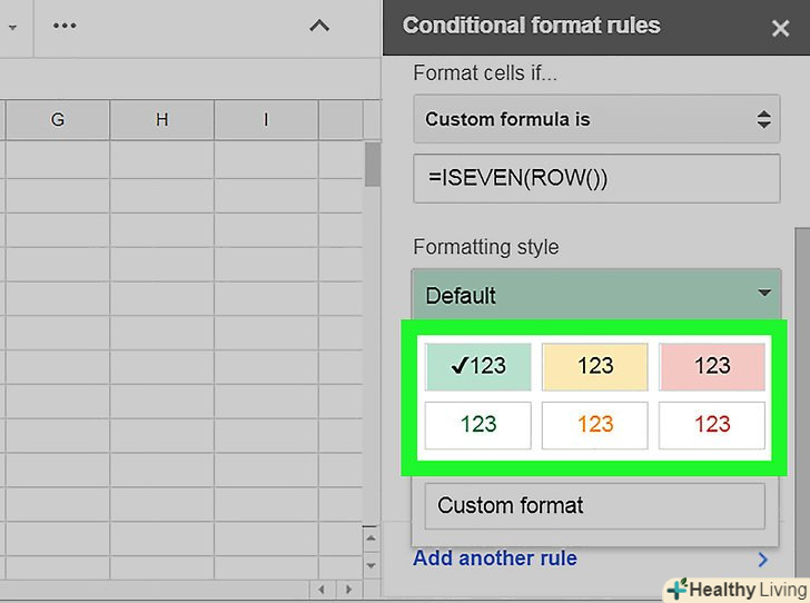 Відкрийте меню в розділі "Формат".у цьому меню відобразиться опція "за замовчуванням" на зеленому тлі. У меню можна вибрати інший колір, яким будуть виділені рядки.
