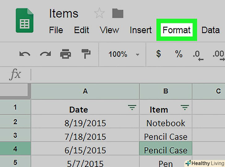 Відкрийте менюФормат. ви знайдете його в рядку меню під ім'ям файлу в лівому верхньому кутку таблиці.