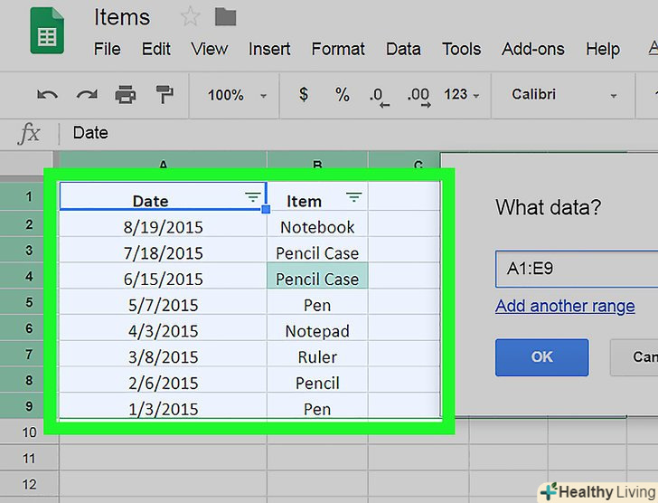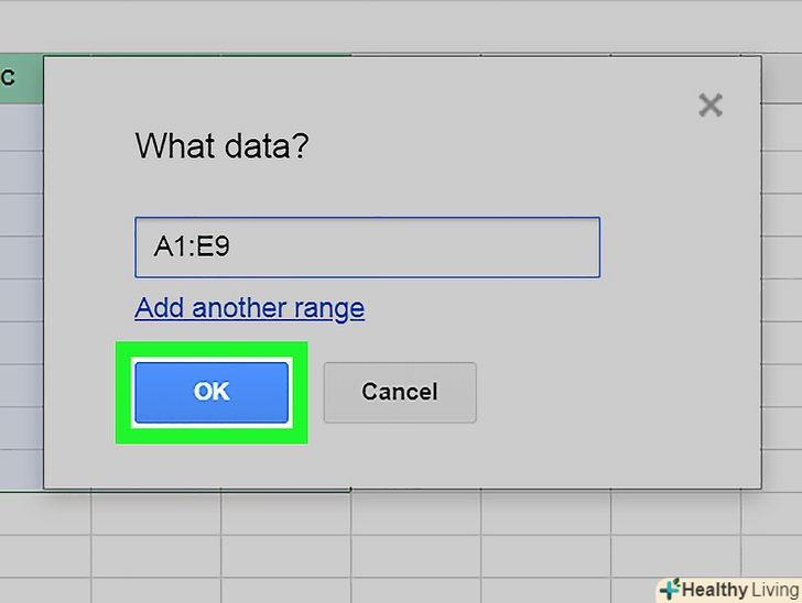 Виберіть діапазон, рядки в якому хочете виділити.для цього клацніть по першій комірці, утримуйте ліву кнопку миші і проведіть покажчиком над потрібними комірками.- Коли ви виділите комірки, відкриється вікно "Виберіть діапазон", в якому відобразиться вибраний діапазон комірок.