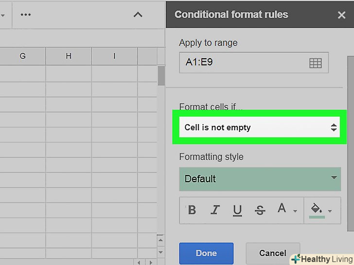 У меню виберіть< span class="nowrap" title="This is not a clickable button; it illustrates the button one should find." style="font-family:Lucida Sans Unicode,Lucida Grande,sans-serif;font-size:14px;padding:0em 1em; border:1px solid; border-color:#AAA #555 #555 #AAA; -moz-border-radius: 4px; -webkit-border-radius: 4px; border-radius: 4px; background-color: #F2F2F2; background-image: -moz-linear-gradient(top, #FCFCFC, #E0E0E0); background-image: -o-linear-gradient(top, #FCFCFC, #E0E0E0); background-image: - webkit-linear-gradient(top, #FCFCFC, #E0E0E0); background-image: linear-gradient (top, #FCFCFC, #E0E0E0);">Умовне форматування.праворуч відобразиться панель форматування.