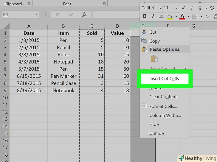 НатиснітьВставити вирізані комірки в контекстному меню.вирізаний стовпець буде вставлений зліва від того, по якому ви клацнули правою кнопкою миші.- Щоб скасувати вставку, натиснітьCtrl+Z (Windows) або ⌘ Command+Z (Mac).