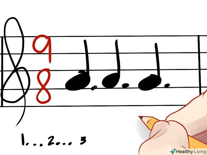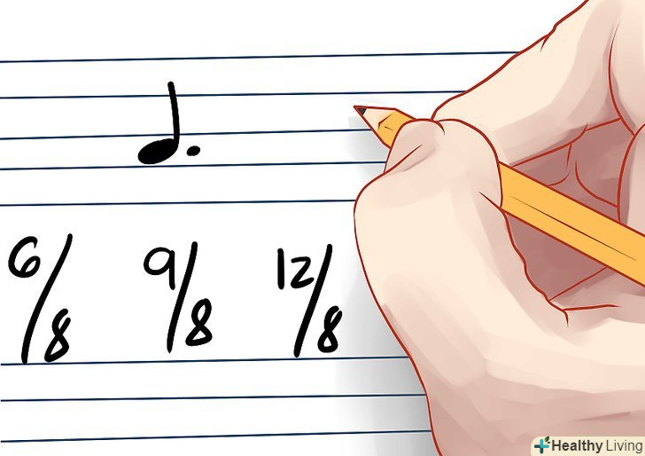Вчіться рахувати в більш складних тактових метрах, таких як 9/8 і 12/8. 9/8 і 12/8 – є складними розмірами і складені з трьох четвертних нот з точками (четвертинки з точками) і чотирьох четвертних нот з точками (четвертинки з точками) відповідно.