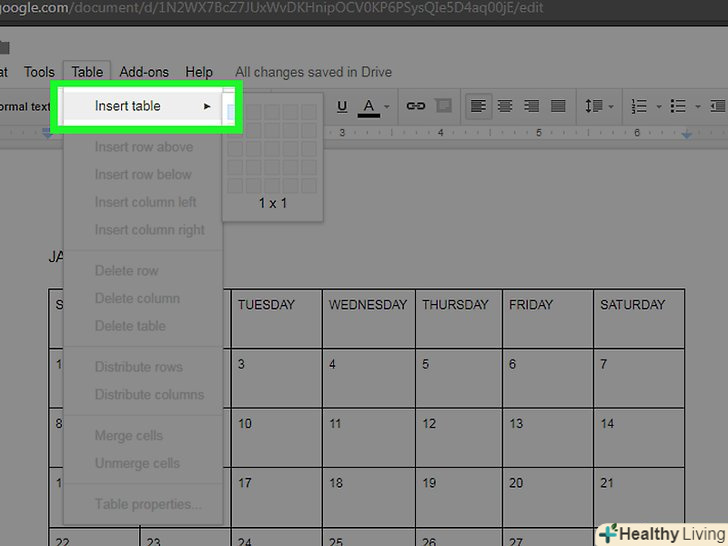 ВиберітьТаблиця. це опція вгорі меню «Вставка". Відкриється вікно з сіткою кубиків.