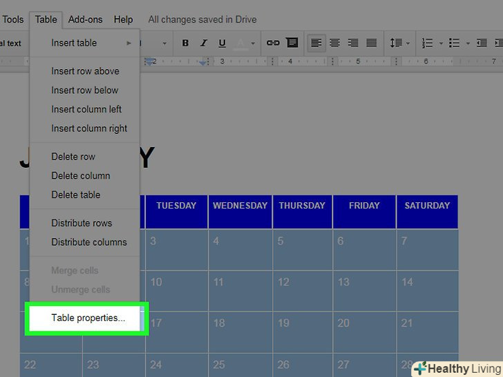 - Змініть кольори певних комірок, стовпців або рядків; для цього виділіть комірки / стовпці / рядки, клацніть по вибраних комірках правою кнопкою миші, натисніть «Властивості таблиці» і в розділі «Колір фону» виберіть потрібний колір.