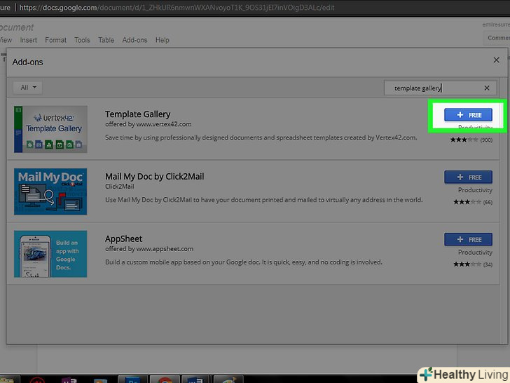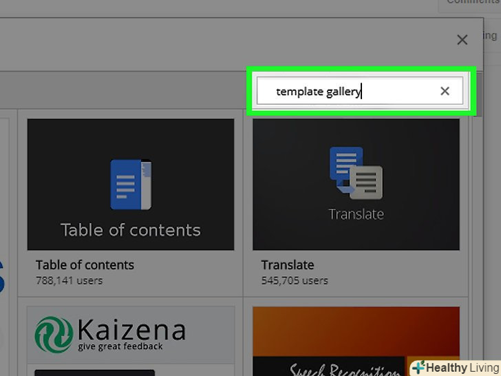 Знайдіть додаток «Template gallery» (Галерея шаблонів) і натисніть< span class="nowrap" title="This is not a clickable button; it illustrates the button one should find." style="font-family:Lucida Sans Unicode,Lucida Grande,sans-serif;font-size:14px;padding:0em 1em; border:1px solid; border-color:#AAA #555 #555 #AAA; -moz-border-radius: 4px; -webkit-border-radius: 4px; border-radius: 4px; background-color: #F2F2F2; background-image: -moz-linear-gradient(top, #FCFCFC, #E0E0E0); background-image:-o-linear-gradient(top, #FCFCFC, #E0E0E0); background-image:-webkit-linear-gradient(top, #FCFCFC, #E0E0E0); background-image: linear-gradient(top, #FCFCFC, #E0E0E0);">+безкоштовно. це доповнення відобразиться у верхній частині результатів пошуку, а зазначена кнопка знаходиться праворуч від Доповнення.