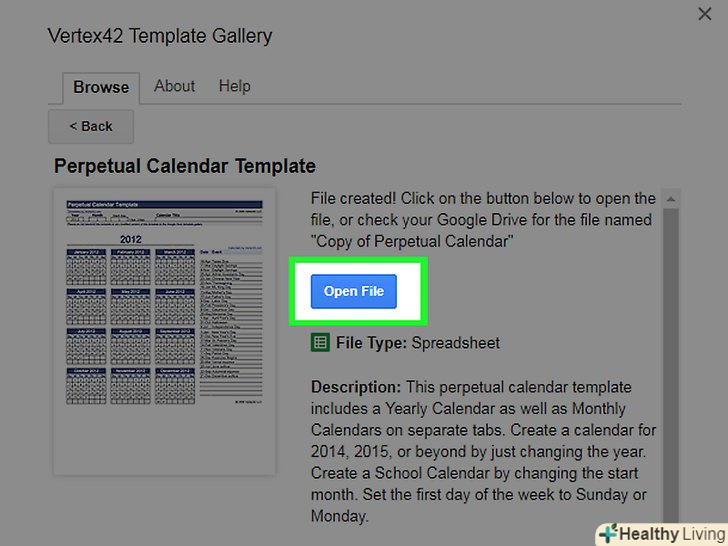 НатиснітьOpen file (відкрити файл).ця кнопка з'явиться замість кнопки "Копіювати на Google Диск". Відкриється шаблон календаря.