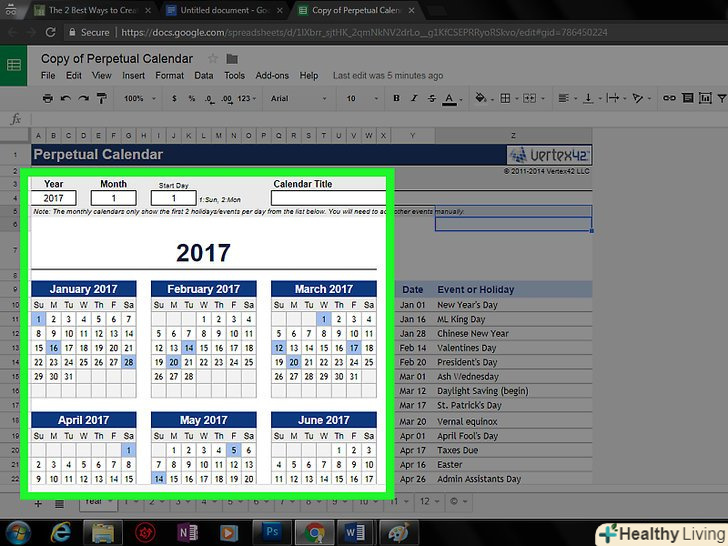 Перегляньте календар.у вибраному шаблоні відобразиться 12-місячний календар за поточний рік; в комірки календаря можна ввести необхідну інформацію.- Відкрити цей календар можна на сторінці Google Диска.