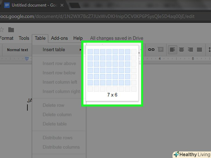 Створіть таблицю розміром 7х6.утримуйте кнопку миші і покажчиком виділіть сім кубиків по горизонталі, а потім перемістіть мишу вниз, щоб вибрати шість кубиків по вертикалі. Коли сітка 7х6 буде виділена синім кольором, відпустіть кнопку миші.- Сітка починається з розміру 5х5, але збільшується в міру переміщення курсору миші.