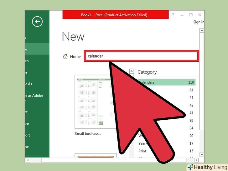 Знайдіть шаблон календаря.у деяких версіях Excel знайдіть розділ "календарі" ; якщо такий розділ відсутній, в рядку пошуку введіть "календар" (без лапок). В інших версіях Excel календарні шаблони відображаються (і виділені) на головній сторінці. Скористайтеся одним з встановлених шаблонів, а якщо вони вам не подобаються, знайдіть календарний шаблон в Інтернеті.[1]- Ви можете знайти шаблон конкретного календаря. Наприклад, якщо вам потрібен навчальний календар, в рядку пошуку введіть "навчальний календар" (без лапок).