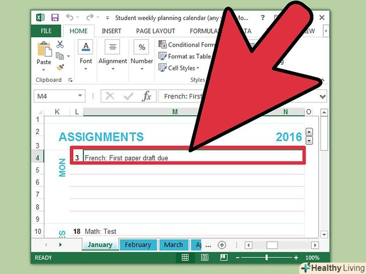 Введіть події. після завершення налаштування календаря введіть події та іншу інформацію. Для цього клацніть по потрібній комірці і вводите дані. Якщо в одну клітинку необхідно ввести кілька подій, поекспериментуйте з різною кількістю пробілів.