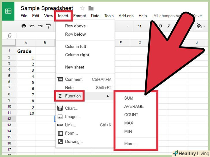 Виконайте функцію.здатність Google Таблиць проводити обчислення є однією з її найбільш корисних функцій. Опція "функція «знаходиться у вкладці» Вставка", а також в дальній правій частині панелі інструментів. Натиснувши на кнопку на панелі інструментів, ви відобразите кілька часто використовуваних функцій (SUM, AVERAGE та інше), а також інші функції в нижній частині меню, що випадає.- В Google Таблицях присутня більшість тих же функцій, що і в Microsoft Excel. Так що якщо у вас вже є досвід роботи з Excel, Робота в Google Таблицях не повинна викликати ніяких труднощів.