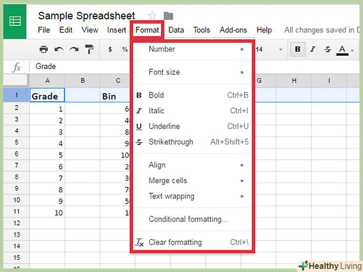 Відформатуйте комірки, рядки або стовпці. щоб змінити цілий рядок або стовпець, натисніть на відповідну букву або цифру. Щоб змінити одну клітинку, виділіть цю комірку. Коли ви виділите потрібний масив даних, натисніть на вкладку «Формат» або виберіть потрібну опцію для форматування (Шрифт, розмір шрифту, напівжирний, Курсив та інше) на панелі інструментів.- За допомогою вкладки "Формат" і панелі інструментів також можна вказати вирівнювання і обтічність тексту або даних в осередку, рядку або стовпці.