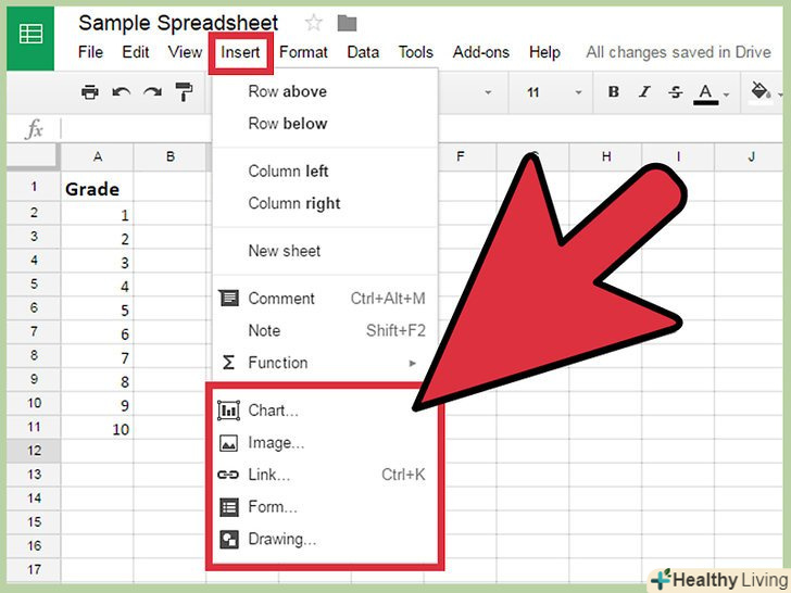 Вставте графіку.різні графічні зображення можуть допомогти іншим краще зрозуміти ваші дані. Опції для вставки діаграми, зображення, посилання, форми або малюнка знаходяться внизу меню, що випадає, яке з'являється після натискання на вкладку «Вставка».